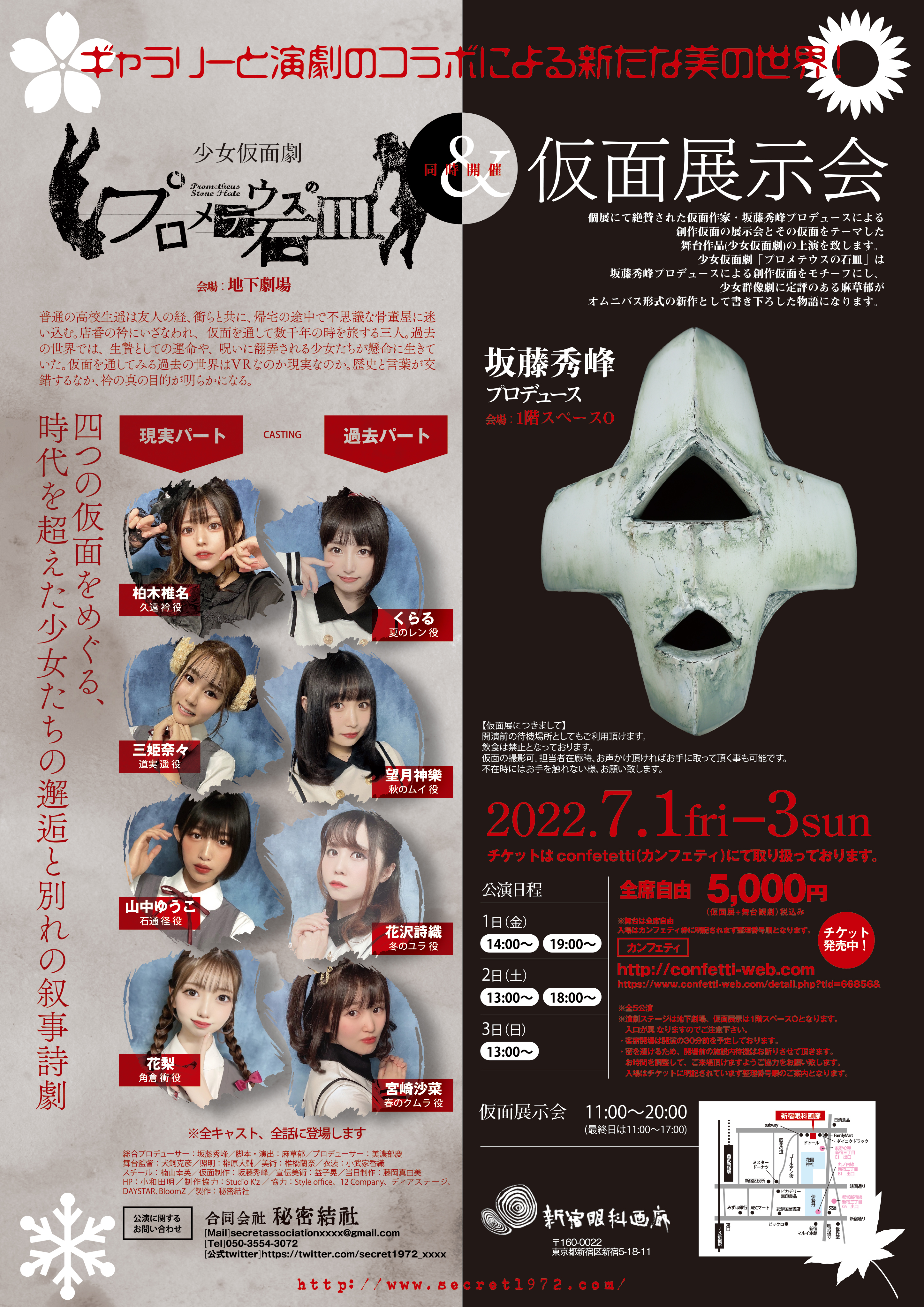 また特設ステージとして、坂藤秀峰プロデュースによる創作仮面をモチーフにした物語を少女群像劇に定評のある麻草郁が新作として書き下ろし、オムニバス形式で上演致します。